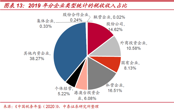 与自然人相关的税收中,一部分是由个体经营者在生产经营中上缴,2019年该比例为5.22%(由《中国税务年鉴(2020)》所得);另一部分是由其他个人缴纳的与买卖出租房产、取得并使用车辆有关的税款,由自然人直接缴纳的税款在征管方面通常并不到位;还有一部分是由企业代扣代缴的个人所得税。整体来看,自然人缴纳的税款只占我国税收收入总额中很小的一部分,企业是最主要的纳税人,这与美国等发达国家以家庭、个人缴税为主,企业缴税为辅的税制显著不同。