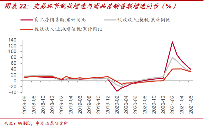 交易环节相关税收的增速与我国商品房销售额增速的变化趋势一致。今年上半年,商品房销售额同比增长38.9%,较2020年全年上升30.2个百分点。相对应的,契税和土地增值税分别同比增长32.7%和30.8%,较2020年全年分别提高19.1和30.7个百分点。