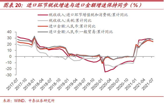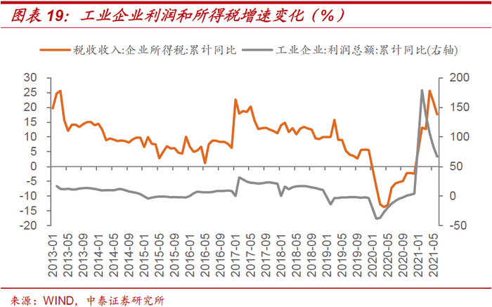 今年以来随着基本面持续修复,低基数下工业企业利润保持较高增速,1-6月累计同比增长66.9%,支撑企业所得税增长17.7%。不过,税收弹性较以往企业盈利高增长时期明显下降,可能和疫后经济复苏不均衡、上中下游企业盈利分化有关。