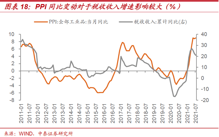由于在我国现行税制结构下,税收收入对工业品价格变化的弹性相对较高,因此我们主要分析税收收入与工业生产者出厂价格指数(PPI)之间的关系。年初以来PPI同比读数持续快速上升,从1月份的0.3%上升到7月份的9%,从而带动以现价计算的税收收入快速增长。随着大宗商品价格上涨势头趋缓,翘尾因素影响下降,预计年内PPI同比将逐渐回落,价格上涨因素对税收收入的拉动作用也将有所减弱。