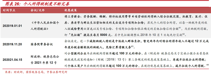2019年以来,我国相继通过扩大个人所得税增税范围(在原有11类征税基础上新引入4类)和提高居民个人所得税免征额,以更好地调节居民收入分配;且实施税收优惠政策减轻中低收入群体、小微企业和个体工商户税收负担,缩小居民收入差距,实现共同富裕。预计低收入群体的所得税优惠政策将通过相关法案进一步加以完善,以调节收入分配和促进社会公平。