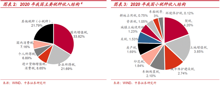 我国现行税制体系中共涵盖18个税种,既包括增值税、消费税、企业所得税和个人所得税等4个主要税种,也包括土地增值税、契税、城市维护建设税、车辆购置税、环境保护税等14个小税种。其中,增值税和企业所得税是最为重要的两个税种,2020年税收收入中,国内增值税[2]占比33.82%,企业所得税占比21.69%,两者合计已经超过全部税收收入的一半(税收占比不含出口退税,下同)。4个主要税种(包括进口货物增值税和消费税[3])和14个小税种2020年的收入比重约为8:2,小税种收入整体占比偏低。