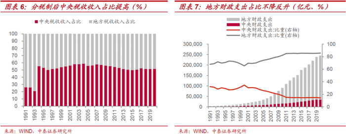 实行“分税制”财政管理体制后,中央税收收入占比显著提高,1993年中央税收收入占比仅为20.77%,1994年大幅提升至55.24%,此后一直稳定在50%左右。相对应的,地方税收收入占比明显下降(1993年为79.23%,1994年为44.76%);而地方政府的财政支出规模和占比却并未减少,1994年地方财政支出比重为69.71%,2020年已大幅提升至85.71%。