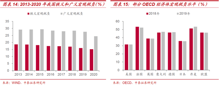 据此计算,近年来我国的宏观税负水平呈现稳中有降态势。从狭义角度看,2013-2020年我国的狭义宏观税负持续下降,从2013年的18.63%逐渐下降至2020年的15.19%。从广义角度看,2013-2020年我国的广义宏观税负维持在30%以下,由于政府一系列减税降费措施的出台,广义宏观税负从2013年的29.12%下降至2019年的27.60%,2020年进一步降低至24.43%。