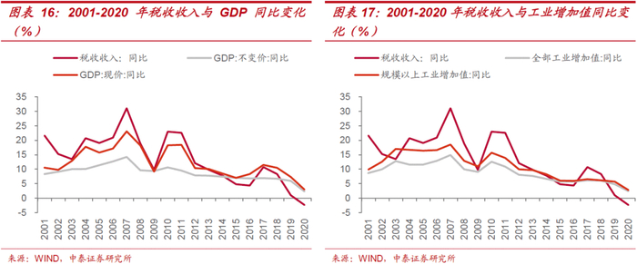 一是价格依据不同。我国税收收入增速按照现价计算,没有扣除物价变动因素,而GDP增长和工业增加值增速按照不变价核算,因此存在价格变化带来的差异。从图表16可以看出,税收收入同比与GDP现价同比具有相似的变化趋势,而与GDP不变价同比的变化趋势差异较大。同样地,税收收入同比与工业增加值同比的变化趋势也具有差异性。