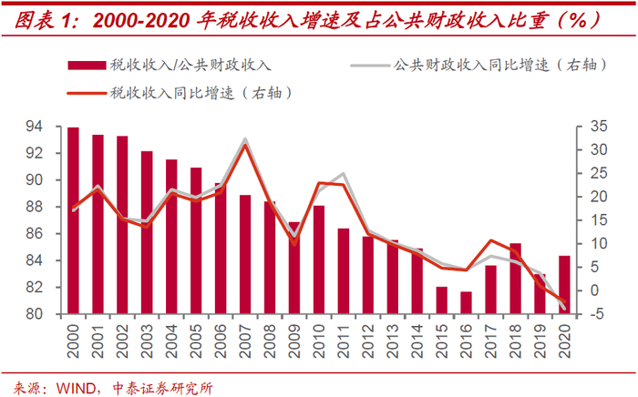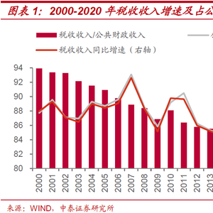 2020年我国实现全国一般公共预算收入182895亿元,同比下降3.9%,其中税收收入154310亿元,同比下降2.3%,税收收入在公共财政收入中的占比为84.37%。近年来虽然税收收入同比增速不断回落,但财政收入增速同样放缓背景下,税收收入占公共财政收入的比重稳定在80%以上。