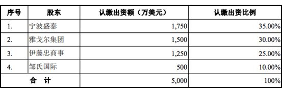 而在2010 年 1 月 19 日,公司通过董事会决议,同意雅戈尔集团将其持有的公司22.47%股权转让予宁波盛泰,将其持有的公司 1.69%股权转让予邹氏国际,将其持有的公司 8.30%股权转让予伊藤忠商事;同意雅戈尔集团当时的全资控股公司新马服装将其持有的公司 6.58%股权转让予伊藤忠商事;同意投资总额增加到7,900 万美元,注册资本增加到 5,000 万美元(增加 3,800 万美元),新增的注册资本由各股东按持股比例认购,并对公司的董事会成员作出相应调整;同意公司中文名称变更为嵊州盛泰色织科技有限公司,英文名称变更为 Sunrise(Shengzhou)textiles Co.,Ltd.。