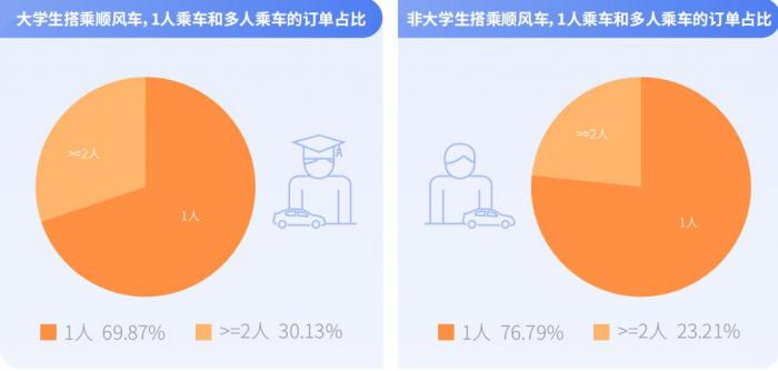 根据嘀嗒顺风车大数据,大学生多人乘车的占比为30.13%,相比非大学生多人乘车占比23.21%,高出近七个百分点,体现了大学生更愿意多人顺风同行。
