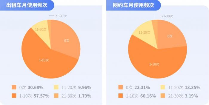 从调研统计看,每月搭乘出租车/网约车1-10次的大学生占比分别为57.57%和60.16%,均为六成左右,可见四轮出行在大学生中的普及度明显提升。同时,每月打出租车11-20次,21-30次的大学生占比之和11.75%,每月打网约车11-20次,21-30次的大学生占比之和为16.54%。
