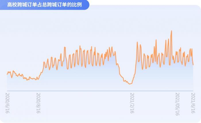 在过往认知中,大学生的生活范围主要在学校周边和市内,跨城出行较少。而根据过去一年嘀嗒顺风车大数据,相比寒暑假的跨城顺风出行低谷,大学生在上学期间的跨城订单占比,一直保持在较高区间。