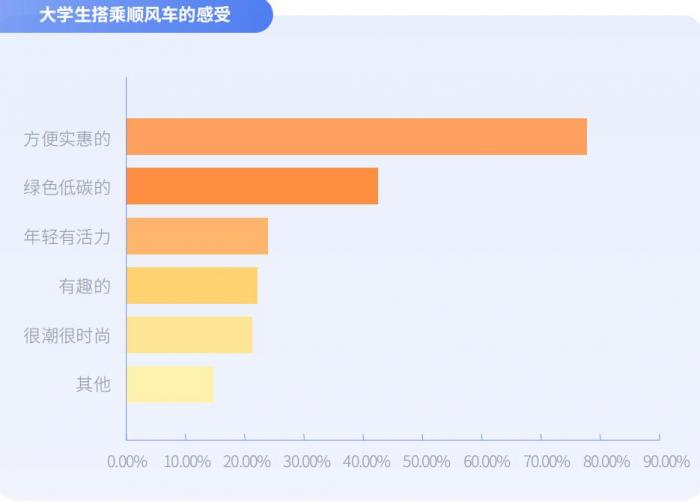 顺风车是顺路分享空座的互助出行,车主顺路分摊油费,并不以盈利为目的,因而较为经济实惠,契合大学生兼顾实惠、体验和效率的出行诉求。