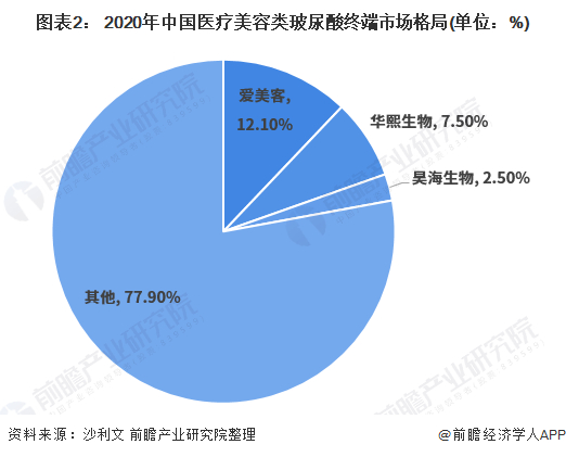 同时,2020年中国医疗美容类透明质酸终端产品市场排名前三的本土企业分别为爱美客、华熙生物、昊海生物,三家市场占比已达到22.1%。