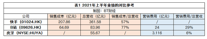 快手营销支出的水平有多高?需要说明的是,目前的上市公司中,能与快手进行直接比较的并不多,不妨拿它和B站、虎牙比较一下。2021年上半年,如果看销售成本/总营收的比值,快手的57%低于B站的77%。再拿在H股和美股两地上市的B站作为“桥梁”,和虎牙来对比可以发现,不难推断快手和B站这类尚在亏损的视频(或短视频)互联网概念股营销费用远高于虎牙。