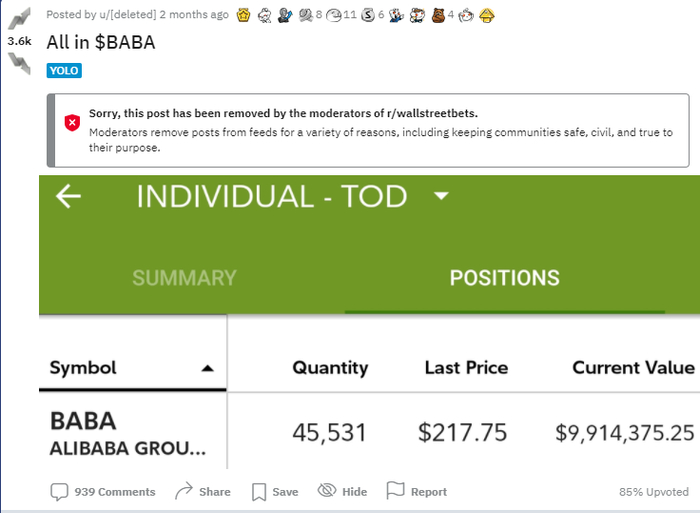 还有人翻出了一名Reddit用户两个月前在阿里股价217美元时全仓买入近1000万美元的历史晒单贴,来安慰其他承受损失的散户。这个历史帖获得了近千条评论和3600个点赞,但可能是因为损失惨重,该贴原贴已经被删除,这个预计损失了上百万美元的发帖用户也已经删号。