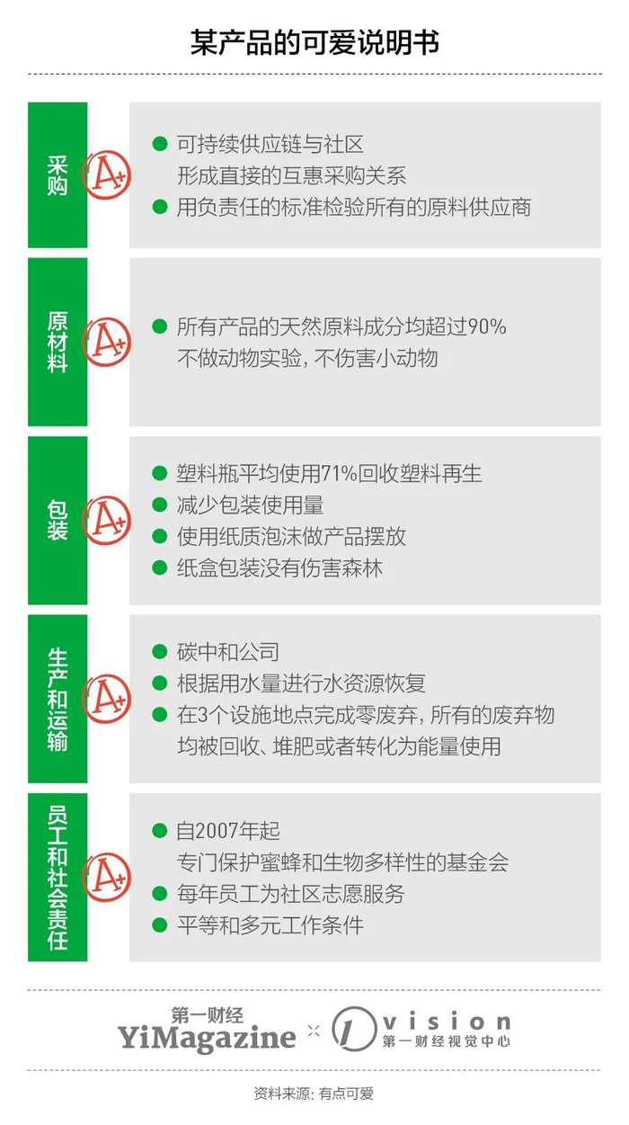 在这些浅显的概念之外,她们贴上了一张“产品生命周期图”,意味着在每一个环节,企业都可以有可持续的举措,而消费者可以依次关注和监督这些方面。被审视的环节包括:采购,原材料,包装,生产和运输,员工和社会责任。