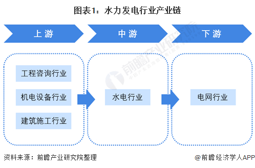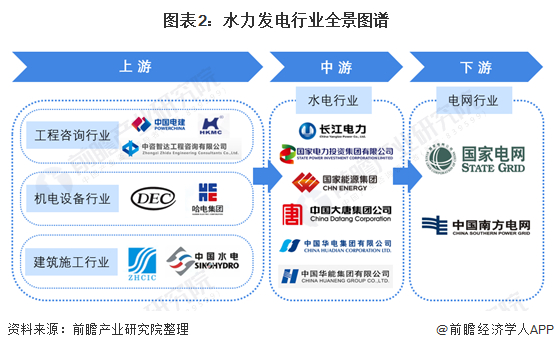 目前,我国水电行业上游的工程咨询行业主要代表企业有中国电建、华昆工程管理咨询有限公司、中咨智达工程咨询有限公司等。机电设备行业主要参与者有东方电气、哈电集团等。水电建筑施工行业代表性企业有浙江省水电建筑安装有限公司、中国水电等。中游的水力发电行业主要是长江电力以及五大发电集团。下游的电网行业主要参与者是国家电网以及南方电网。