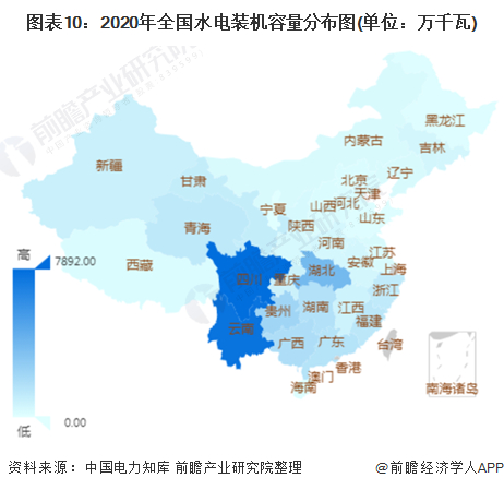 我国水力资源丰富,但其时、空分布不均。时间上,分布不均衡,总体看,中国大多数河流年内、年际径流分布不均,丰、枯季节流量相差悬殊,稳定性较差,调节能力不够好。根据中国电力知库数据统计,截止至2020年,四川省的水电装机容量7892万千瓦排在全国第一;云南省位居第二,其水电装机容量7556万千瓦;湖北省排在第三,其水电装机容量仅有约云南省的一半——3757万千瓦;其次是贵州、广西、湖南、广东省。