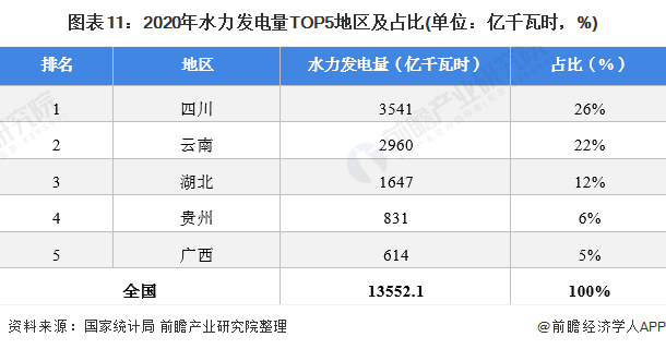 2020年中国水力发电量最多地区为四川,水力发电量为3541亿千瓦时,占比26%;其次是云南地区水力发电量为2960亿千瓦时,占比达到22%;再次是湖北地区水力发电量为1647亿千瓦时,占比达到12%。