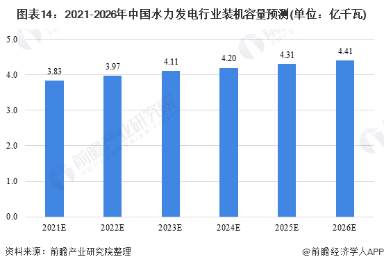 2021年2月国家能源局下发可再生能源消纳目标建议函,官方首次正式提出2030年非化石能源占比目标25%并确保完成,明确2030年可再生占比须达到40%。根据中国水电发展远景规划,到2030年水电装机容量约为5.2亿kW,其中,常规水电4.2亿kW,抽水蓄能1亿kW,水电开发程度约60%;到2060年,水电装机约为7.0亿kW,其中,常规水电5.0亿kW,新增扩机和抽水蓄能2.0亿kW,水电开发程度73%,届时基本达到西方国家的开发水平。基于以上数据,前瞻预测到2026年时,我国水电装机量预计达到4.41亿千瓦。