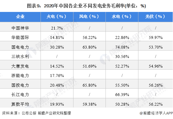 根据2020年部分能源电力龙头企业数据分析,火电相比风、水、太阳能发电的毛利率较低。风电、水电、光伏发电均属于高毛利的发电业务。水电相较于风电、光伏的毛利率较低。
