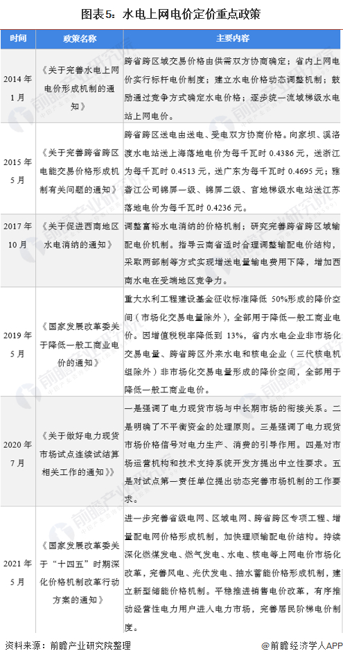 2013年5月6日,国务院总理李克强在主持召开国务院常务会议上,要求年内出台完善水电上网价格形成机制改革方案。2013年初,发改委在小范围内对水电定价机制的改革征求了意见,2014年1月11日,发改委发布《关于完善水电上网电价形成机制的通知》,明确不同情境下水电价格形成与确定的机制。2017年10月,针对西南地区尤其是四川、云南弃水问题,实现水电资源的充分利用和优化配置,发布《促进西南地区水电消纳的通知》,在其中提出完善价格机制,提高水电竞争力。2019年,发改委进一步要求降低一般工商业电价。