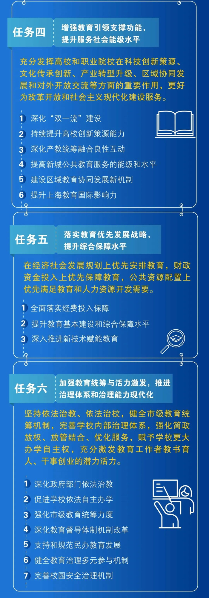 “十四五”期间,上海将围绕“服务人的现代化、服务经济社会发展、做强关键支撑”三个关键点,上海面向未来五年,提出了教育发展“2+2+2”任务体系。