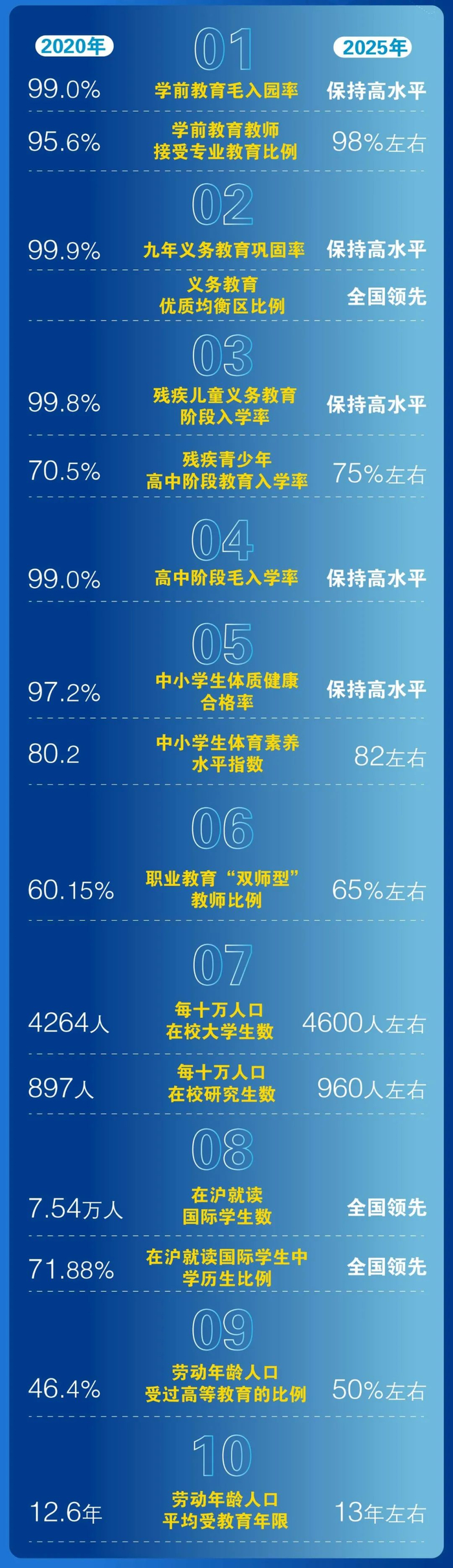到2025年,上海教育现代化将全面深入推进,实现更加包容、更具活力、更大开放、更高品质发展,高质量教育体系总体建成,教育事业发展和人力资源开发主要指标接近全球城市先进水平。