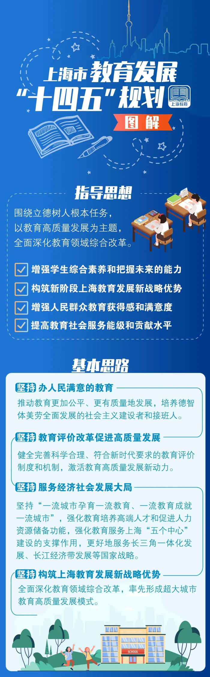 市教委说,近期,上海市政府印发了《上海市教育发展“十四五”规划》(以下简称《规划》):到2025年,教育现代化全面深入推进,实现上海教育更加包容、更具活力、更大开放、更高品质发展,高质量教育体系总体建成,教育事业发展和人力资源开发主要指标接近全球城市先进水平。