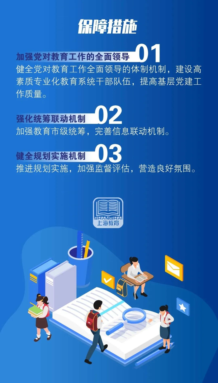 第三个“2”是增强物质技术资源和治理体系治理能力两个方面保障。在物质基础保障方面,上海将落实教育优先发展战略,提升综合保障水平,在经济社会发展规划上优先安排教育、财政资金投入上优先保障教育、公共资源配置上优先满足教育和人力资源开发需要,进一步加大经费投入,强化基本建设保障,推进信息技术运用,为教育高质量发展奠定更为坚实的基础。在推进教育治理体系和治理能力现代化方面,上海坚持依法治教、依法治校,健全市级教育统筹机制,完善学校内部治理体系,强化简政放权、放管结合、优化服务,进一步向基层教育单位放权,赋予学校更大办学自主权,充分激发教育工作者教书育人、干事创业的潜力活力。