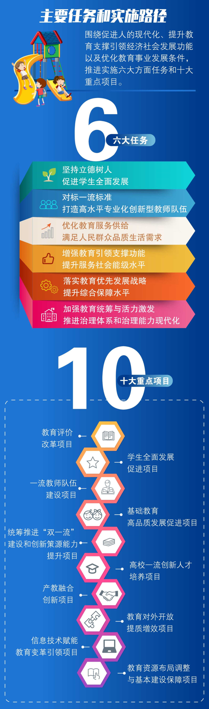 具体目标包括:服务学生全面而有个性发展的教育体系日趋完善;基本公共教育服务实现更高水平均等;优质教育服务供给丰富扩大;教育服务社会发展能力彰显提升;教育影响辐射能力稳步增强。