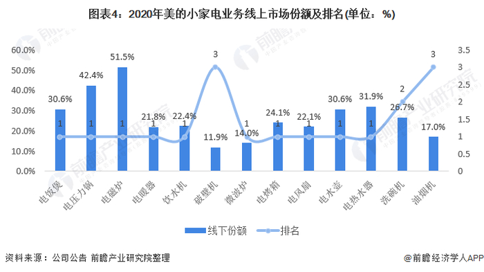 目前,中国小家电行业龙头企业是美的集团。2020年,根据美的集团披露的2020年相关小家电业务线下线上市场份额占比及排名情况来看,美的集团在绝大部分小家电细分产品领域均处于领先地位,排名行业前三,在电饭煲、电压力锅和电磁炉等细分产品线上线下市场份额均超过40%,持续位列细分产品行业首位。但整体来看,大部分小家电产品线上份额占比小于线下份额占比。