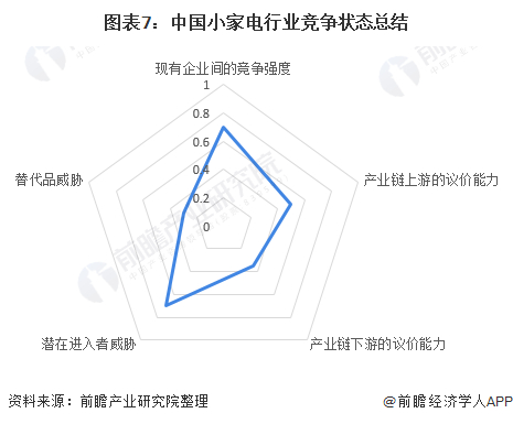 从五力竞争模型角度分析,目前,我国小家电行业属于传统行业,替代品威胁较小;现有竞争者数量较多,但市场集中度较高;上游供应商一般为基础制作、金属、材料以及电子芯片等企业,议价能力适中,而下游消费市场主要是消费者,议价能力较弱;同时,因行业技术门槛较低,潜在进入者威胁较大。