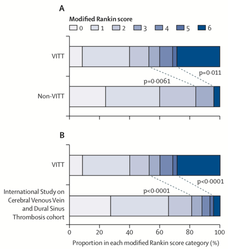 该研究首次表明,VITT相关脑静脉血栓形成患者与非VITT患者相比,VITT相关的患者更年轻,并且更可能接种过阿斯利康的(ChAdOx1)疫苗。此外,其中有更大比例的颅内静脉血栓(intracranial veins thrombosed)和颅外血栓(extracranial thrombosis),且患者中死亡和需依靠他人照料的比例更大。