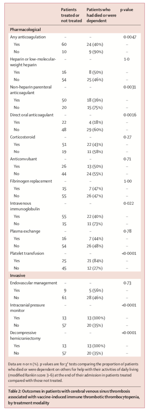 从治疗手段上看,给予非肝素肠外抗凝(non-heparin parenteral anticoagulation)、直接口服抗凝剂(direct oral anticoagulant)或静脉免疫球蛋白(intravenous immunoglobulin)有利于改善VITT相关脑静脉血栓形成形成患者的病情。结果表明,给予非肝素肠外抗凝治疗的患者中的死亡或依赖他人照料比例为36%,该比例在未采取该治疗手段患者中为75%。直接口服抗凝剂治疗的患者的死亡或依赖他人照料比例18%,该比例在未采取该治疗手段患者中为60%。直接口服抗凝剂治疗的患者的死亡或依赖他人照料比例40%,该比例在未采取该治疗手段患者中为73%。(见表2)