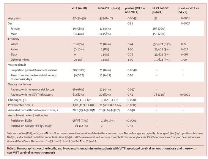 2021年4月至5月20日期间,研究者从英国43家医院共收集95名接种新冠疫苗后出现脑静脉血栓形成病例的有效数据,其中70人患有VITT,25人未患VITT。研究者详细记录了VITT相关的脑静脉血栓形成患者的临床特征、实验室和影像学结果,并将其与未患VITT的脑静脉血栓形成患者以及国际脑静脉和硬膜窦血栓研究(International Study on Cerebral Venous Vein and Dural Sinus Thrombosis, ISCVT)队列的624名患者的历史数据进行比较。