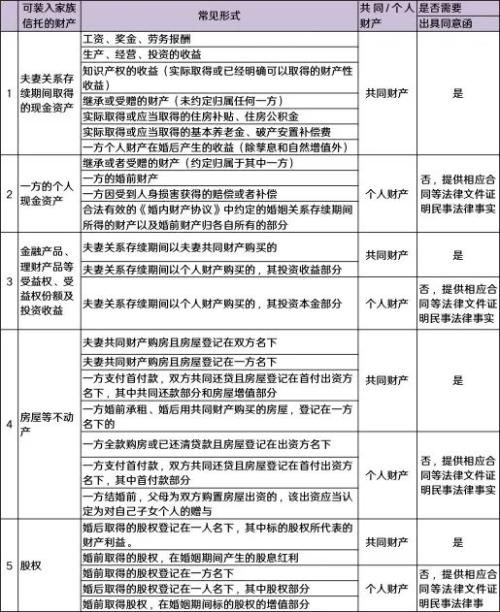 家族信托业务初期,委托设立的家族信托的财产以现金和金融产品为主,随着业务不断深入,越来越多委托人更青睐将股权、不动产、保险保单、艺术品和其他资产装入家族信托。通过上文分析可知,委托人设立家族信托时,是否需要提供《配偶同意函》取决于拟设立信托的财产是属于个人财产还是夫妻共同财产。为此,笔者对常见的装入家族信托的财产进行梳理,仅供参考。