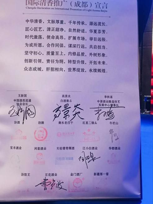 ▲汾酒、江小白等清香型白酒企业和机构一同签署了“国际清香推广(成都)宣言”,决定一同推动清香酒的市场开拓