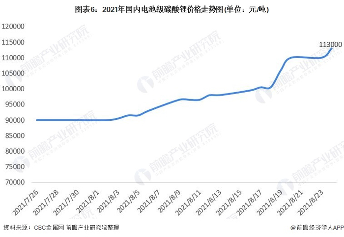从价格上来看,由于下游新能源动力电池需求的带动,电池级碳酸锂材料价格也在不断上涨,截至2021年8月24日,国内电池级碳酸锂价格上涨到113000元/吨。