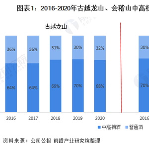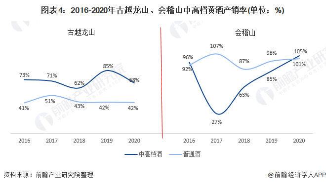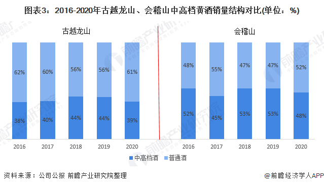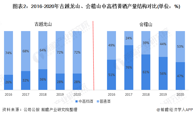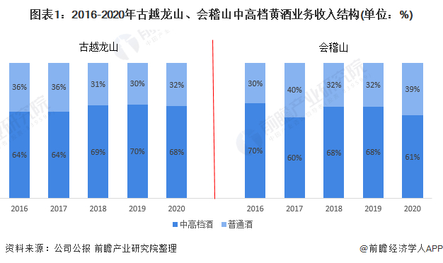 伴随中国消费水平提升和国内酒水消费的结构性调整,个人和商务消费开始占据酒水市场的主导地位,中高端消费需求不断扩容。与白酒企业相同,我国黄酒企业也在布局高端市场。黄酒企业通过高端产品,提升自己的品牌力,为全国化布局做好积累。由于黄酒行业高档黄酒、普通黄酒相关数据较少,前瞻选取古越龙山、会稽山两家上市企业对其中高端黄酒业务布局效果进行分析。