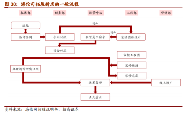 海伦司新酒馆一般需要大约2-3个月的时间完成从选址到具备开业条件的整体流程,直营模式下海伦司将拓店流程中各个任务分配到公司不同部门,拓展部负责选址和签订合同,财务部负责支付款项,运营中心负责筹备支持,工程部负责装修设计,营销部负责线上推广,各个部门各司其职,通力协作,提升了拓店效率。