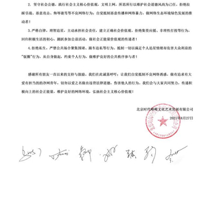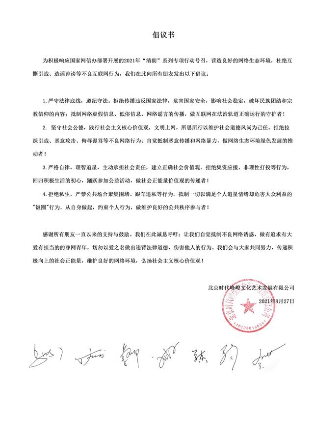 新京报讯 8月27日,时代少年团为积极响应国家网信办部署开展的2021年“清朗”系列专项行动号召发表倡议书。