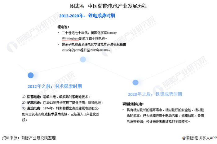 在2012年之前,在电化学储能领域,主要使用的是铅蓄电池、纳基电池和液流电池,由于电池寿命较系统效率等问题,2012-2020年,锂电池开始被广泛应用,2020年之后,由于磷酸铁锂具有相对较长的循环寿命、相对较好的安全性、相对较低的成本,预计在未来将是储能的主流技术。