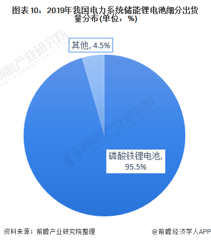 按照正极材料的类型划分,锂离子电池分为三元锂电池、磷酸铁锂电池,其中,磷酸铁锂相对三元锂电更适合储能场景。2019年我国电力系统储能锂电池出货量中磷酸铁锂电池占比达95.5%。