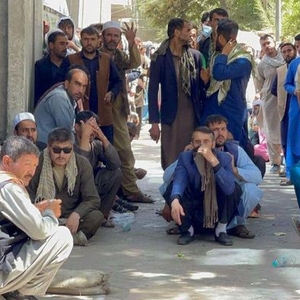 塔利班接管阿富汗喀布尔后,人们在一家银行外排队取出现金。图/澎湃影像