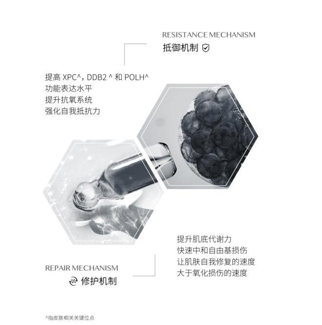 两种成分包含了双重抗氧化机制,即抵御机制和修护机制。一方面,RNAEPIGEN通过提高皮肤屏障相关的基因XPC, DDB2 和POLH功能表达水平,增强皮肤纤维内聚力,强化抗氧系统和自我抵抗力;另一方面,PHOEPIGEN能够有效增强皮肤角质层功能,提升细胞代谢力,快速中和自由基损伤。