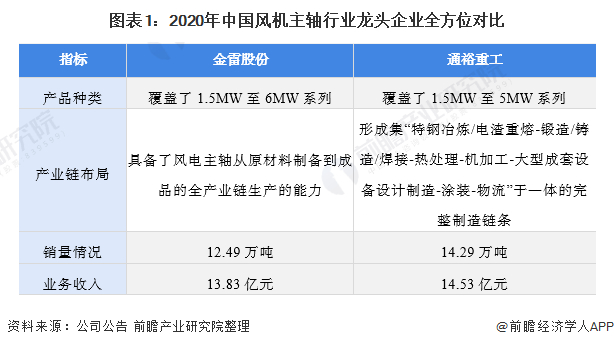 目前,中国风机主轴行业的主要龙头企业分别是金雷股份(300443)和通裕重工(300185)。从产品种类来看,金雷股份覆盖了1.5MW至6MW系列的风电主轴,而通裕重工则是覆盖了1.5MW至5MW系列的风电主轴。