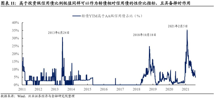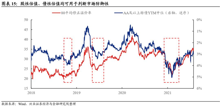 当然,从资产整体视角出发,当转债整体具有债性,相比纯债有较高价值时,往往是配置的机会。对于固收投资者而言,这个角度更好理解也更好赚钱。其实,此时用股性指标去研判,也往往能发现类似的结论。