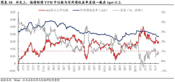 (1)偏债品种同信用债收益率对比:当AA评级中票收益率与AA评级以上转债中位数YTM的差值接近1%左右,转债相对于信用债的配置价值显著提升,中期持有收益大概率高于信用债。另外,如果转债YTM高于AA级中票收益率的比例出现极值,则往往是风格切换的信号。