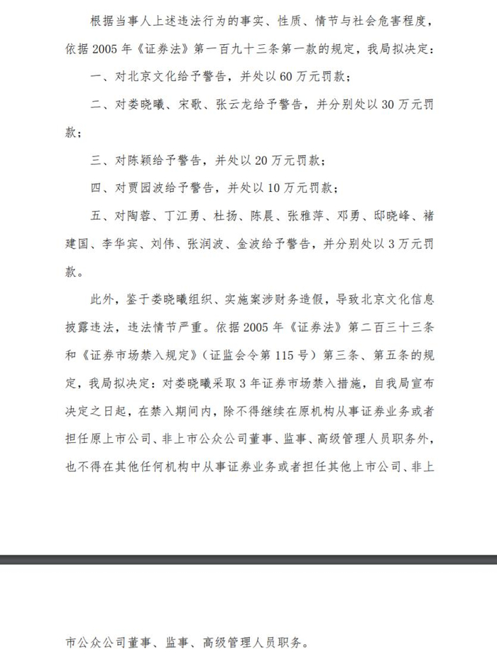 此外,鉴于娄晓曦组织、实施案涉财务造假,导致北京文化信息披露违法,违法情节严重。北京证监局拟决定:对娄晓曦采取3年证券市场禁入措施,在禁入期间内,除不得继续在原机构从事证券业务或者担任原上市公司、非上市公众公司董事、监事、高级管理人员职务外,也不得在其他任何机构中从事证券业务或者担任其他上市公司、非上市公众公司董事、监事、高级管理人员职务。