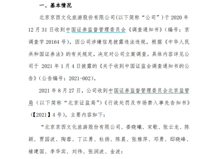 证监会指出,2020年12月,证监会依法对北京京西文化旅游股份有限公司(下称北京文化)涉嫌信息披露违法行为立案调查。